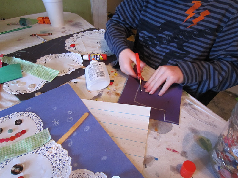 Then the boys lined up and glued on a small, medium and large doily to make the snowman's body. I didn't have any small doilies so I cut some of the lacy part off the medium doily to make it smaller.